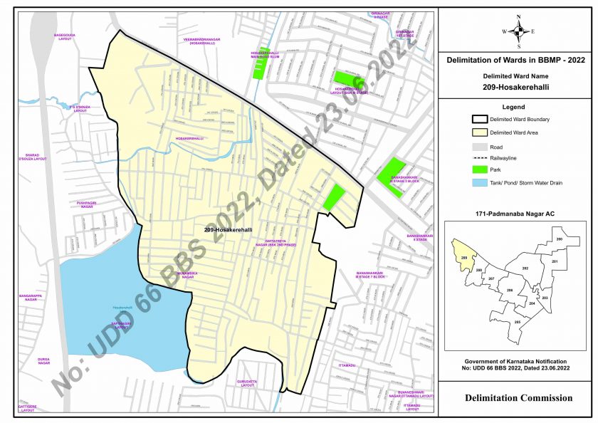 ,ದಕ್ಷಿಣ : 23ನೇ ಅಡ್ಕ ರಸ್ತೆ, 2ನೇ ಮುಖ್ಯ ರಸ್ತೆ, ಮಳೆ ನೀರು ಚರಂಡಿ [ಹಾಲಿ ಇರುವ ವಾರ್ಡ್ ಮತ್ತು ವಿಧಾನಸಭಾ ಕ್ಷೇತ್ರದ ಗಡಿ)