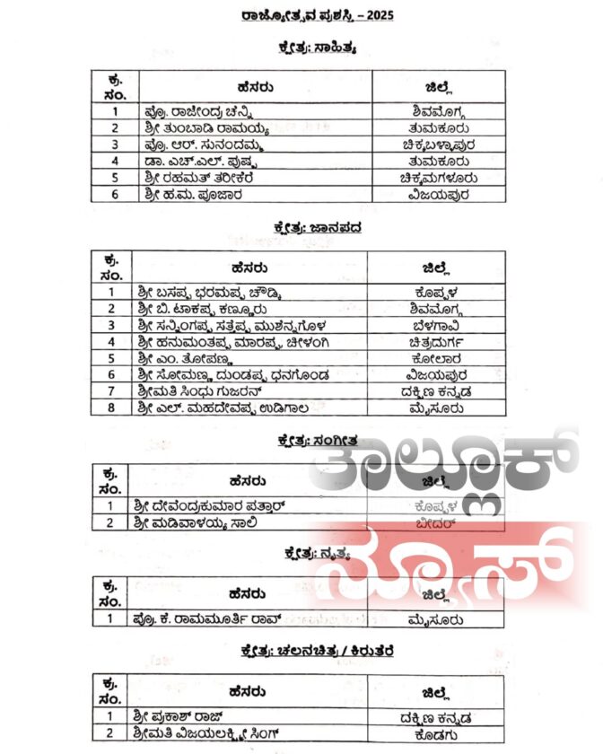 ಬೆಂಗಳೂರು: ನಾಡಿನ ವಿವಿಧ ಕ್ಷೇತ್ರಗಳಲ್ಲಿ ಅಸಾಧಾರಣ ಸೇವೆ ಸಲ್ಲಿಸಿ ಕರ್ನಾಟಕದ ಕೀರ್ತಿ ಎತ್ತಿದ ಗಣ್ಯರನ್ನು ಗುರುತಿಸಿ ರಾಜ್ಯ ಸರ್ಕಾರವು 2025ನೇ ಸಾಲಿನ ರಾಜ್ಯೋತ್ಸವ ಪ್ರಶಸ್ತಿಗಳನ್ನು ಘೋಷಿಸಿದೆ.