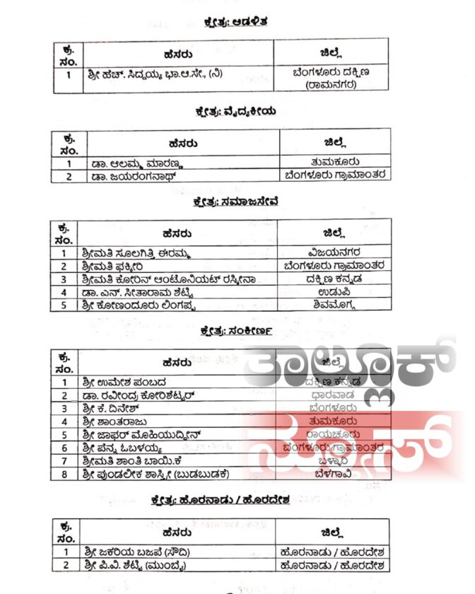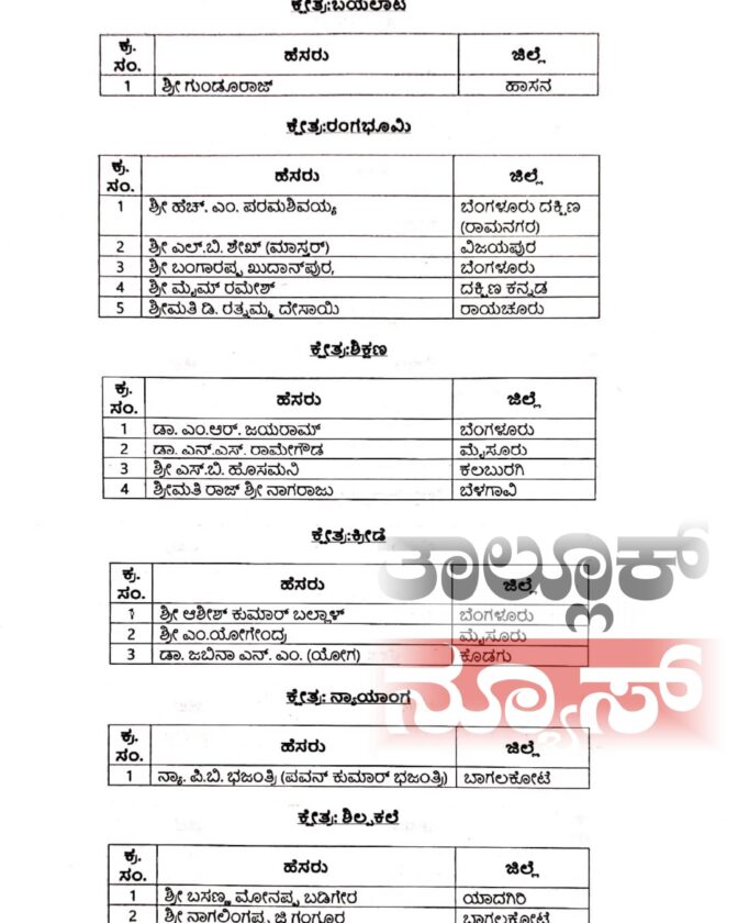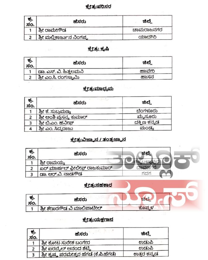 ಸಾಹಿತ್ಯ, ಜಾನಪದ, ಸಂಗೀತ, ಶಿಕ್ಷಣ, ಕೃಷಿ, ಕ್ರೀಡೆ, ವೈದ್ಯಕೀಯ, ಸಾಮಾಜಿಕ ಸೇವೆ ಸೇರಿದಂತೆ ಅನೇಕ ಕ್ಷೇತ್ರಗಳಲ್ಲಿ ಶ್ರೇಷ್ಠ ಕೊಡುಗೆ ನೀಡಿದ ಸಾಧಕರು ಈ ಗೌರವಕ್ಕೆ ಪಾತ್ರರಾಗಿದ್ದಾರೆ.